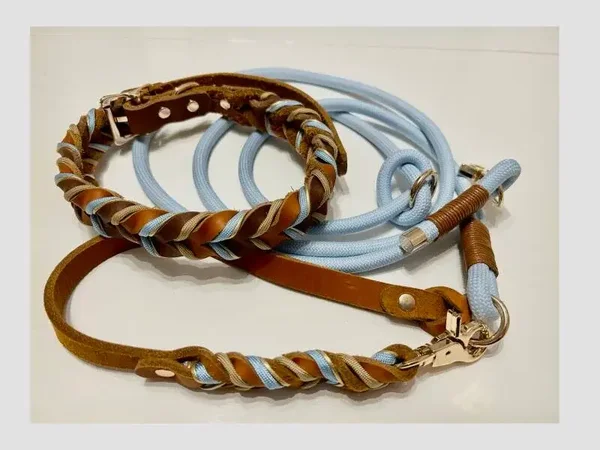 Traumhaftes Paracord Set, handgearbeitet und angenehm weich mit einem wunderbaren, echten Leder. In der edlen Farbkombination: hellblau, beige, gold, braun. XXL 55-67 cm M 39-46 cm